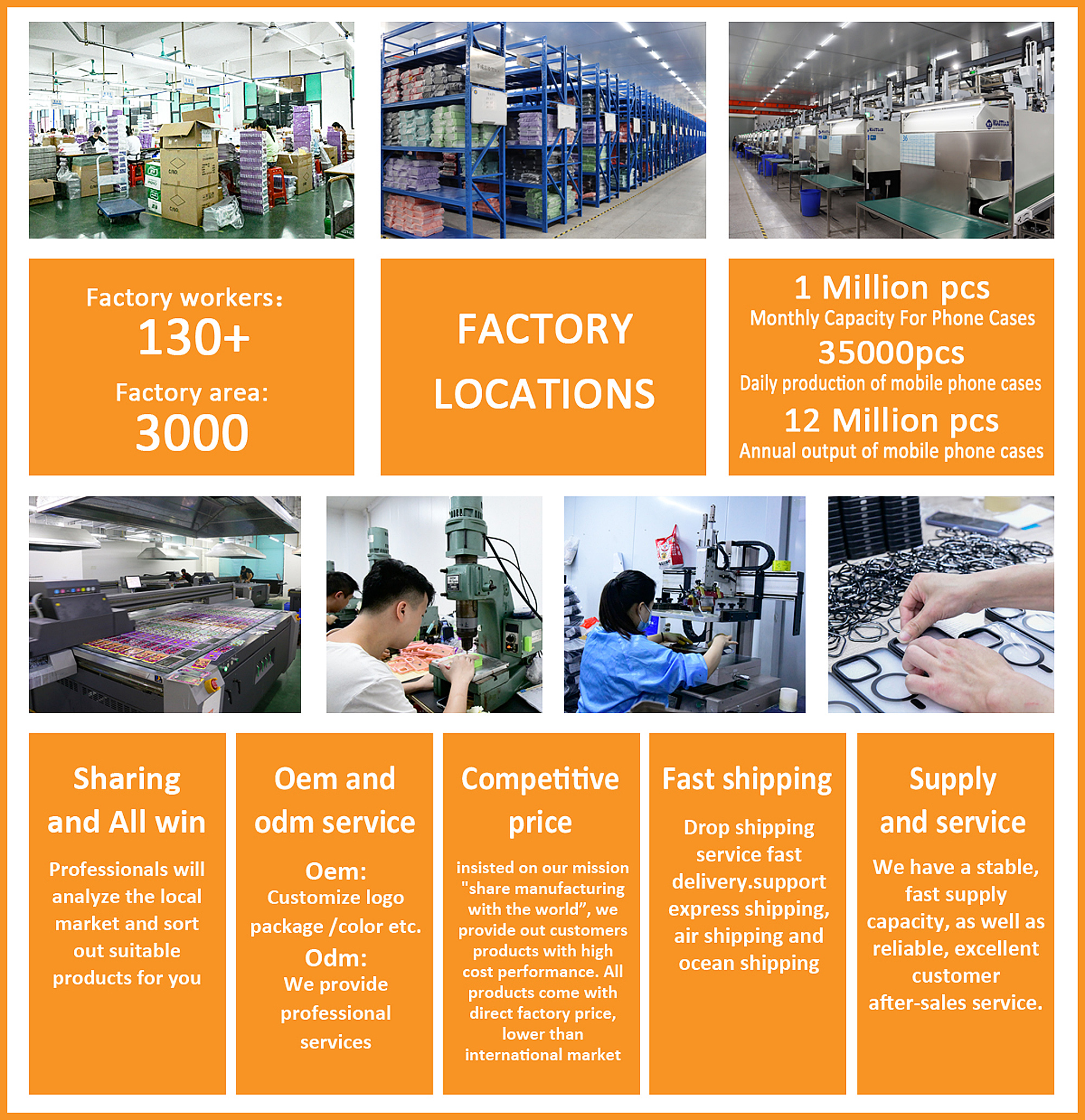 Nuestro departamento de moldes cuenta con varios equipos de fabricación de moldes de precisión con procesos completos. El departamento de plásticos cuenta actualmente con 54 máquinas de moldeo por inyección de precisión de varios tonelajes equipadas con máquina de 5 ejes y línea de ensamblaje para boquillas de punzonado (corte) automático. Nuestra capacidad de producción anual es más de 20 millones de piezas moldeadas por inyección y más de 600 conjuntos de fabricación de moldes; Además de las ventajas del moldeo por inyección de molde abierto, los procesos auxiliares antes y después de la producción de fundas para celulares, también están completos: Corte de láminas, hacer diseños, poner pegamento o semi cuero, serigrafía, tampografía, ensamblaje, empaque y otras tecnologías, pueden proporcionar a los clientes diversos estilos de fundas de alta caidad.